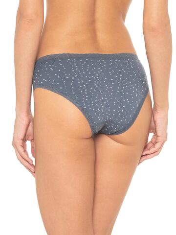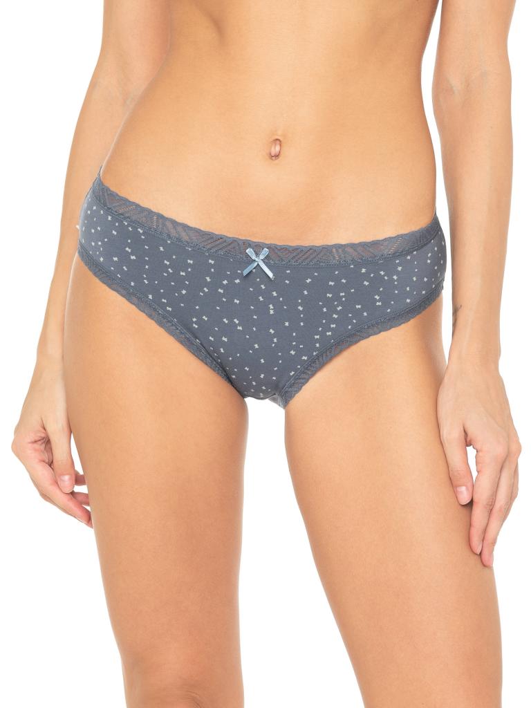Трусы со средней линией талии, выполнены из мягкого принтованного хлопка со спандексом. Принт с изображением бабочек. Вырез ножки и талия отделаны широкой кружевной резинкой в цвет изделия. Декор - атласный бантик. Хлопковая ластовица.