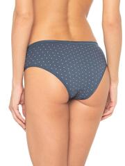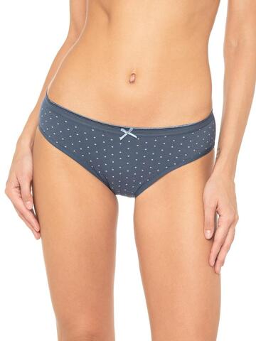 Трусы со средней линией талии, выполнены из деликатного принтованного хлопка со спандексом. Контрастный принт с изображением треугольников. Вырез ножки отделан тесьмой в цвет изделия, талия - широкой тесьмой с мережкой, в цвет изделия. Декор - атласный бантик. Хлопковая ластовица.