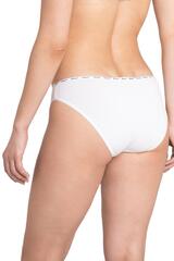 Трусы-слипы со средней линией талии, выполнены из однотонного хлопкового плотна. Для обработки талии использована узкая декоративная резинка с контрастным логотипом. Хлопковая ластовица.