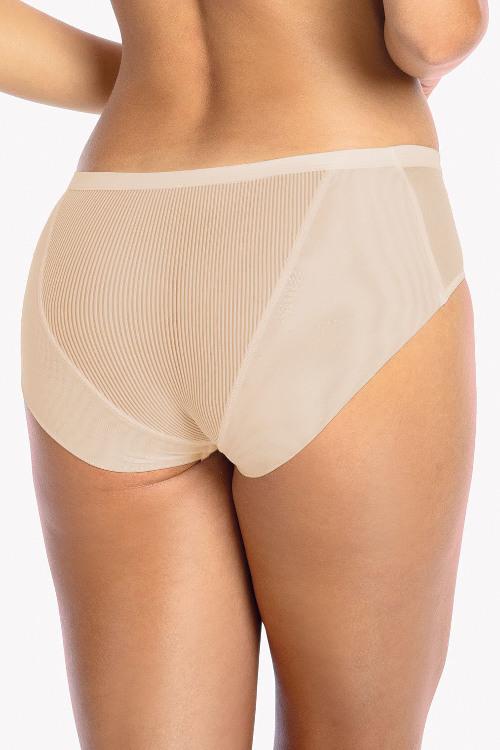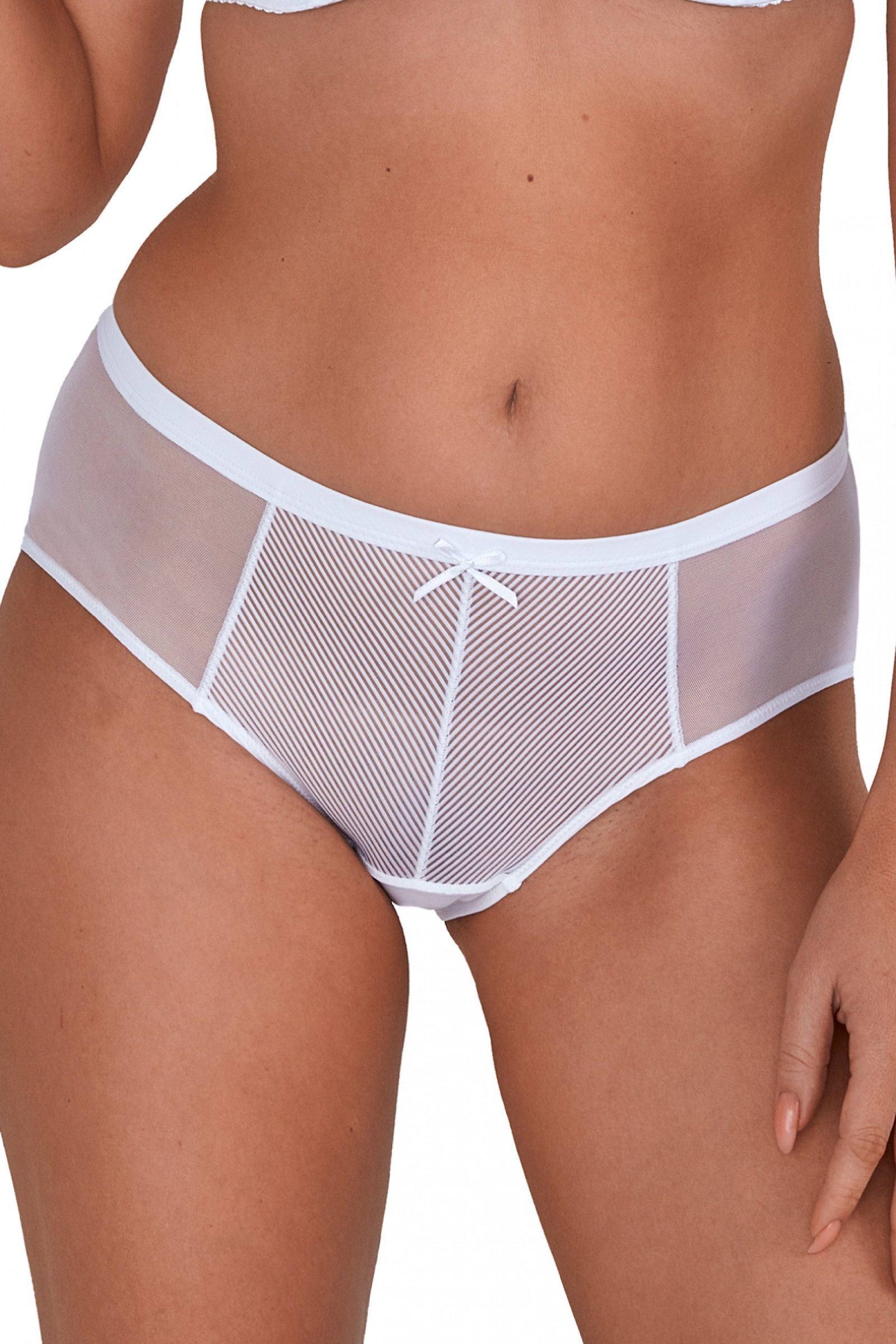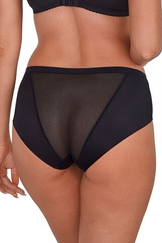 Трусики-слипы Sonia выполнены из эластичной полосатого трикотажа и сетки, на спинке вставки из сетки, сложенной вдвое. Ластовица проложена 100% хлопком.