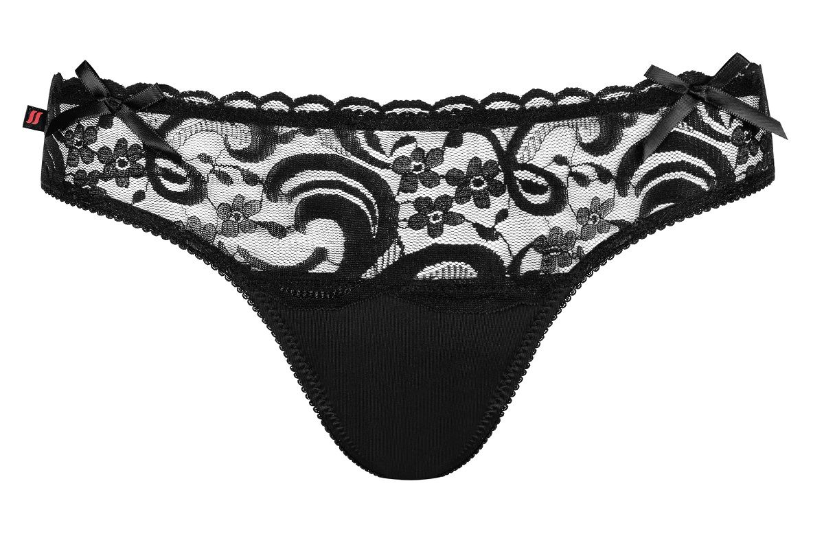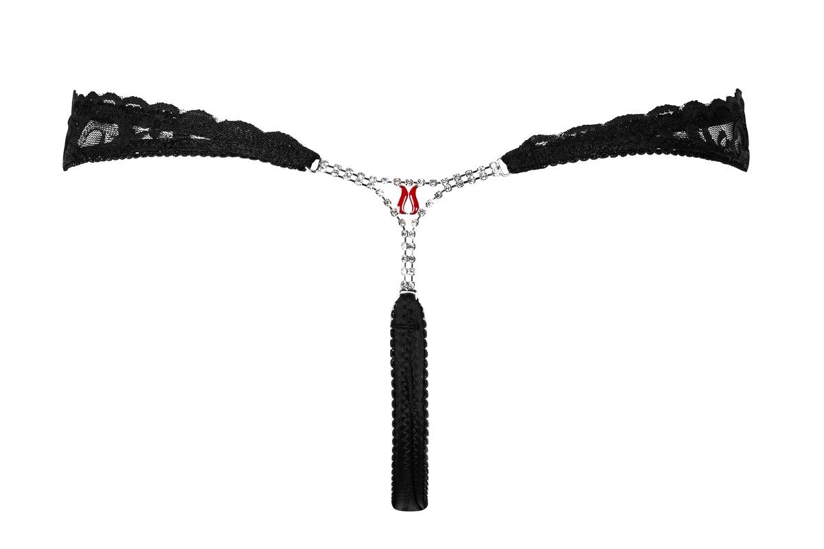Элегантные стринги, изготовленные из тонкого эластичного кружева с металлическим элементом сзади в виде буквы V с вкраплёнными блестящими камешками и маленьким красным тюльпаном в середине.