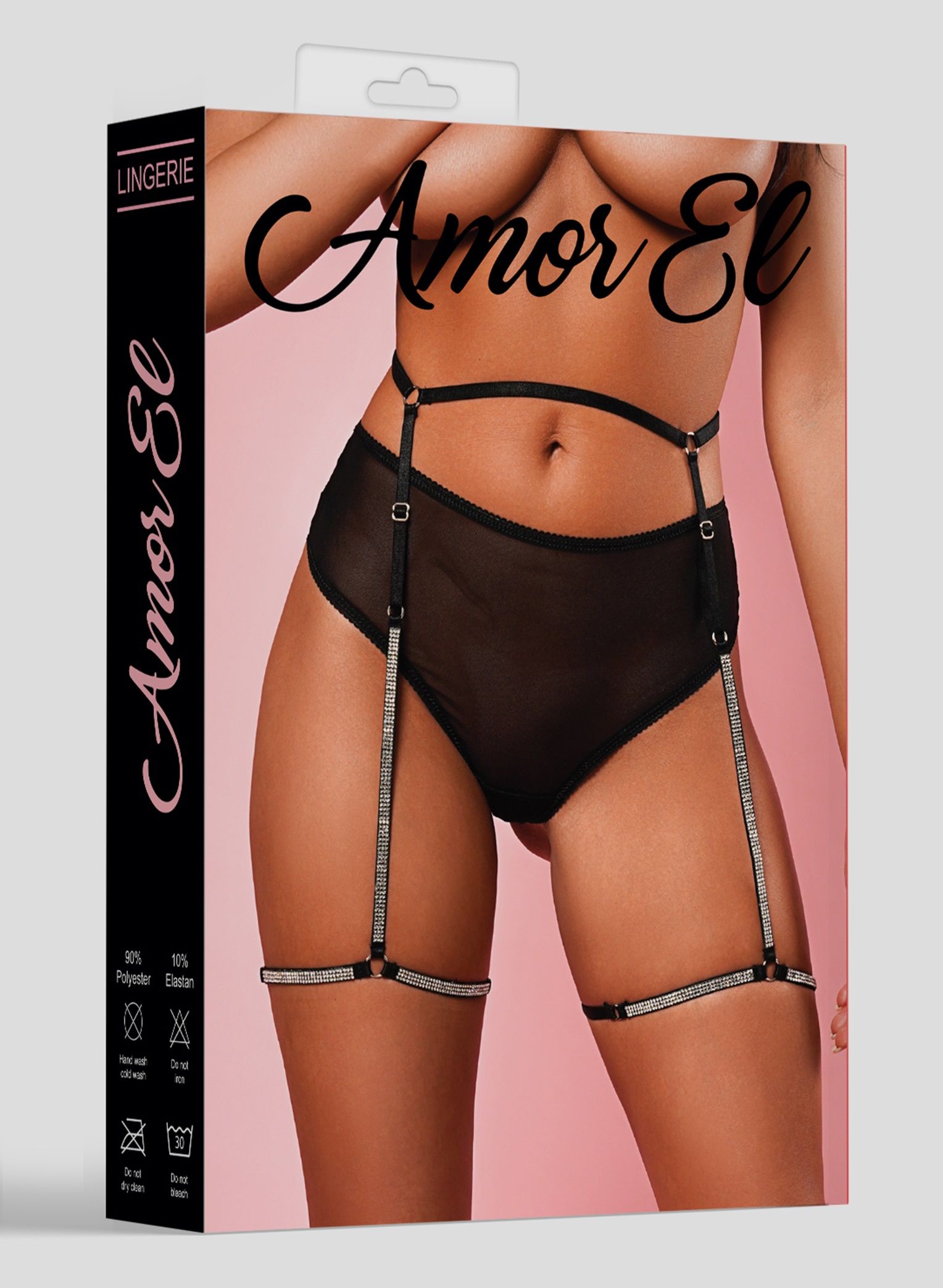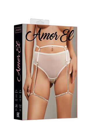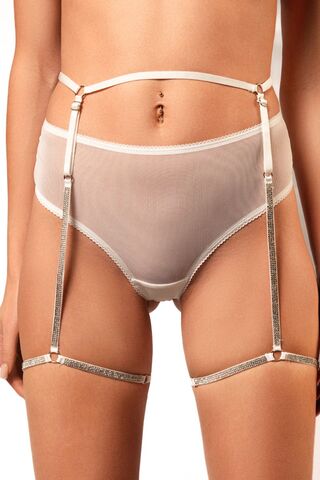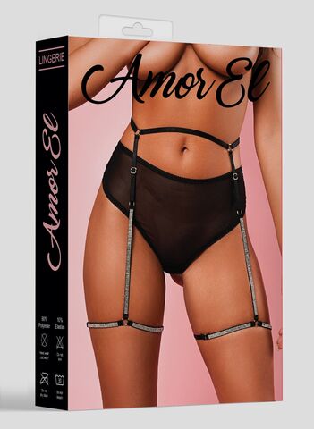 Трусики-танга с поясом, украшенным кристаллами на гартерах. Пояс имеет регуляторы на талии и на ногах. В комплекте: трусики, пояс с гартерами.