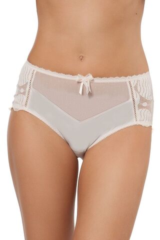 Эти удобные и элегантные классические трусы придутся по вкусу многим женщинам. Бедра украшены кружевом, а передняя и задняя части изготовлены из не просвечивающей ткани, что соответствует общему стилю этой модели. Модель украшена мережкой по бокам и вышитым гладью тюлем спереди. Линия бедер отделана декоративной резинкой, а линия талии украшена изысканным кружевом «ливерс», а также бантиком из атласа и кружева.