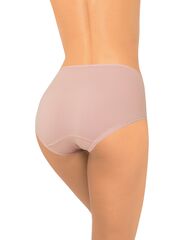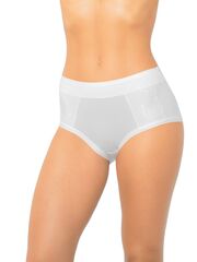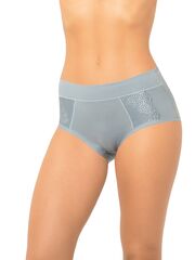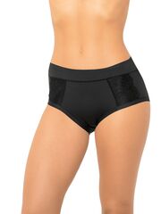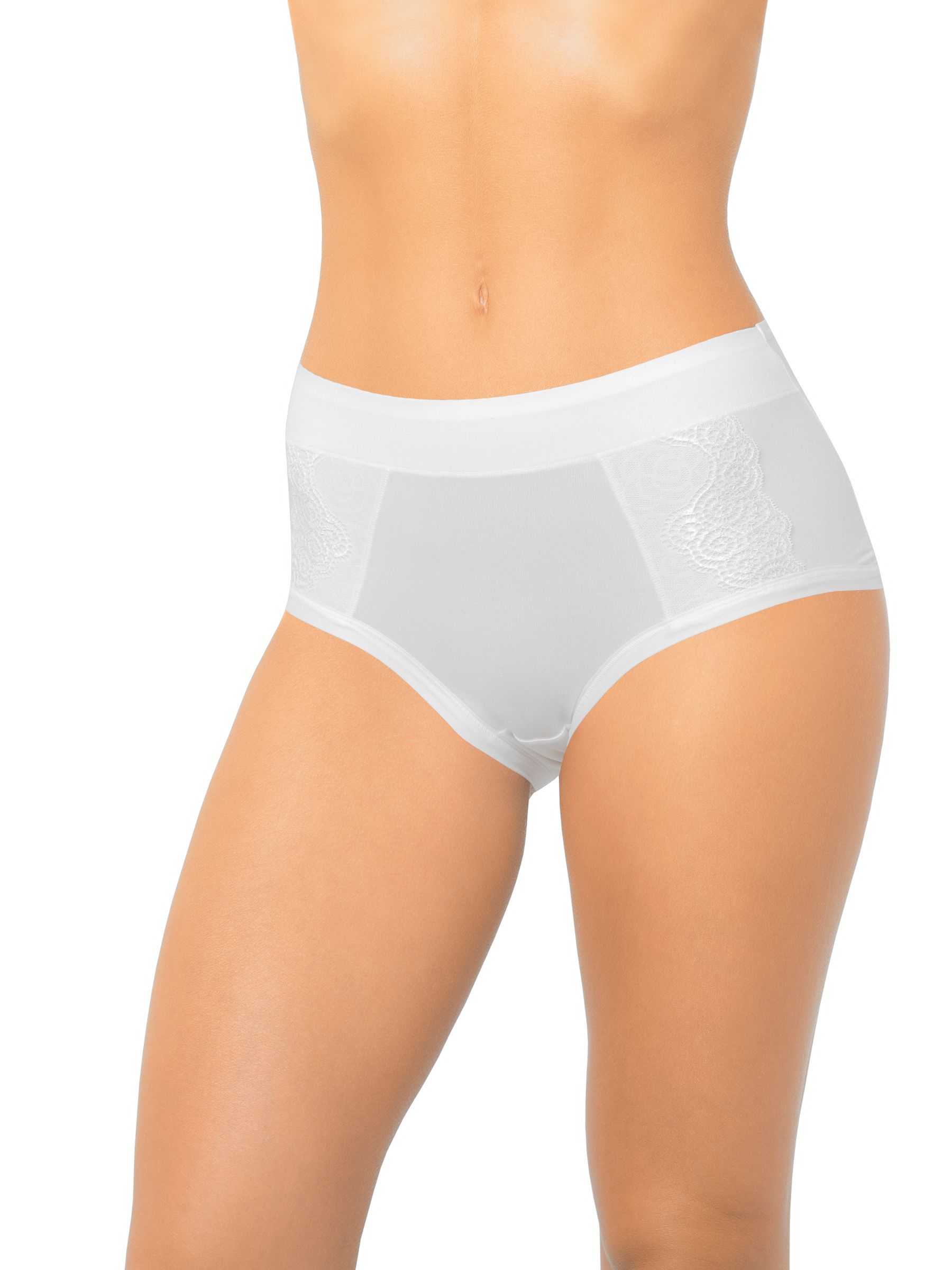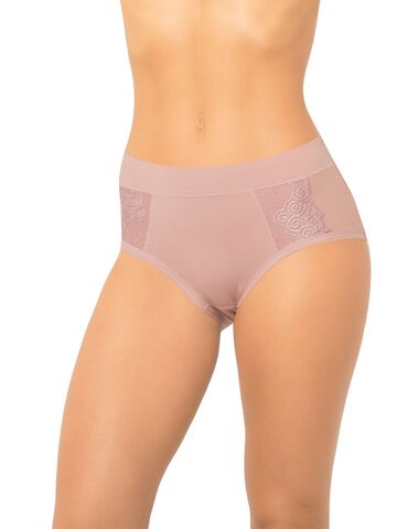 Трусы с высокой линией талии, выполнены из мягкого бамбукового полотна со спандексом. Вставка посередине передней детали дублирована основным полотном, что дает небольшой корректирующий эффект. Максимально комфортная обработка по ножке. Декор - кружевные ставки на передней детали.