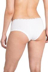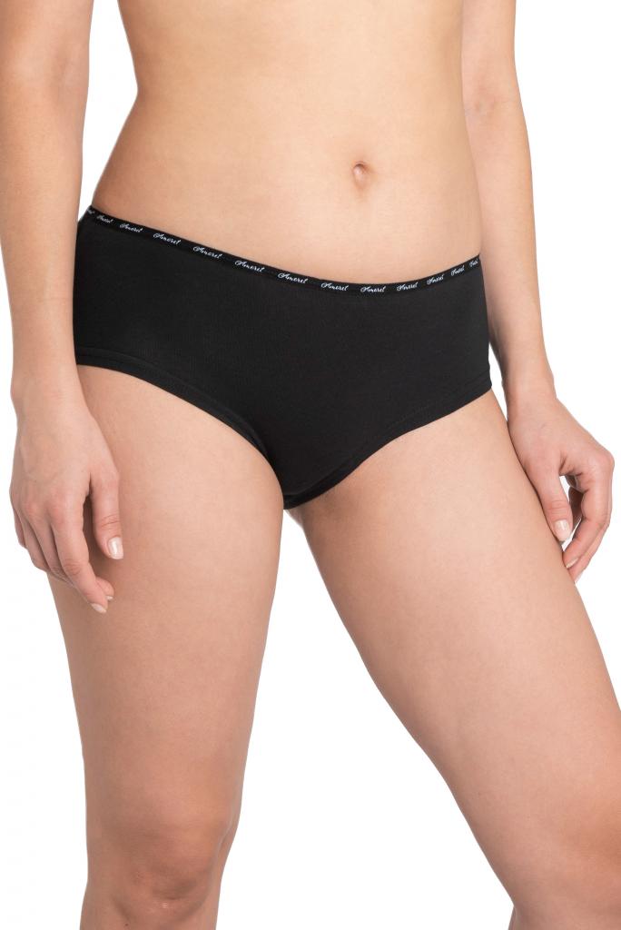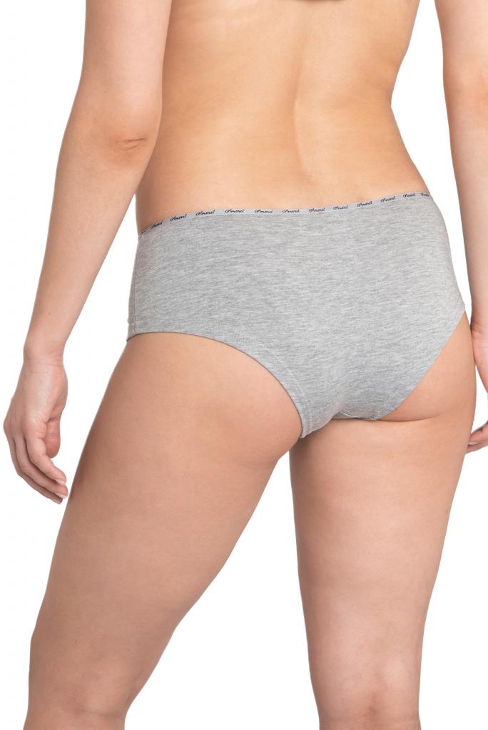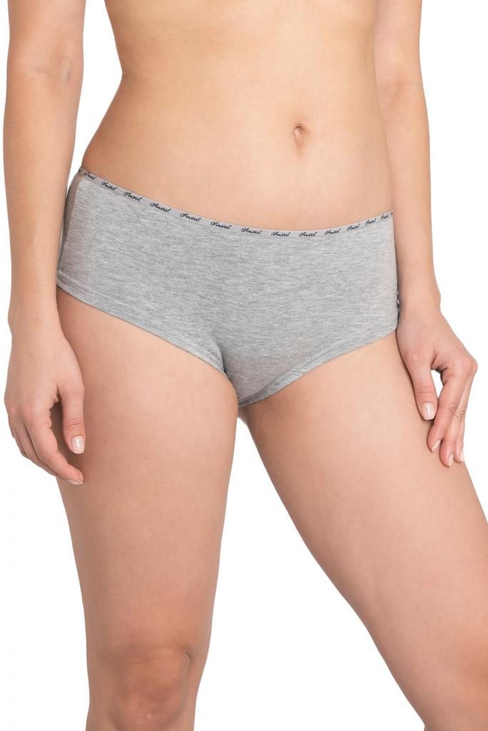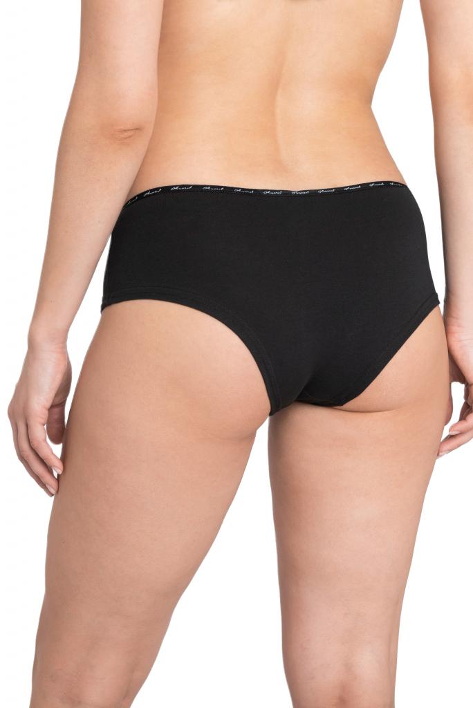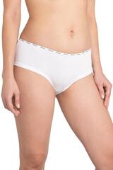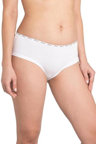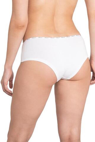Трусы-шорты со средней линией талии, выполнены из однотонного хлопкового плотна. Для обработки талии использована узкая декоративная резинка с контрастным логотипом. Хлопковая ластовица.