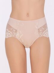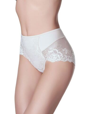 Трусы-слип с высокой линией талии из эластичной микрофибры в сочетании с плоским цветочным кружевом с бесшовным краем сзади. Высота бочка 14 см. Передняя кружевная часть дублирована микрофиброй, что обеспечивает легкую поддержку зоны живота. Пояс обработан плоской резинкой 0,5 см. Ластовица выполнена из уникального хлопкового материала.