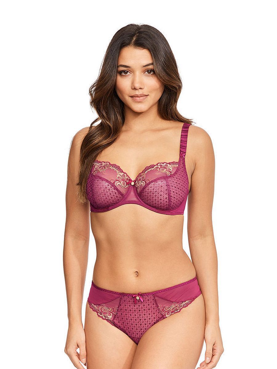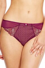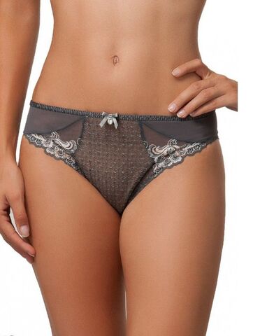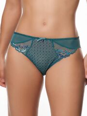 Трусы с высоким вырезом по линии бедра. Боковые вставки округлой формы создают нежный и женственный образ. Передние же вставки из тюля с вышивкой отличаются элегантностью и придают стройность бедрам. Эта очень удобная модель подходит для повседневной носки.