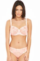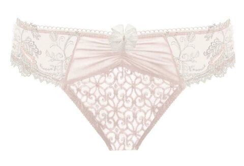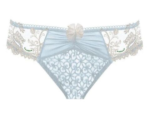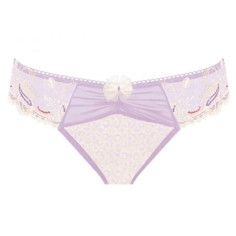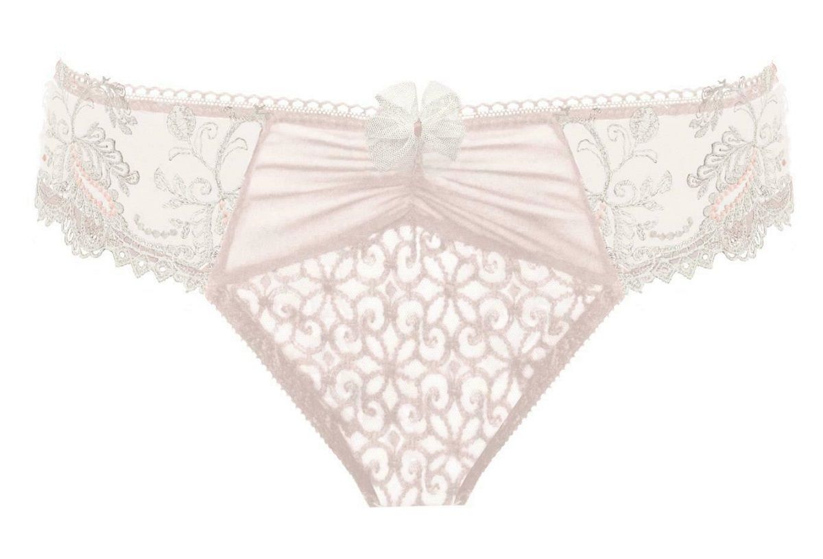 Бедра украшены изящной вышивкой, а передняя часть – красивой вставкой из расшитой ткани, плиссированным тюлем и муслиновым бантиком. Линия талии подчеркнута декоративной резинкой.