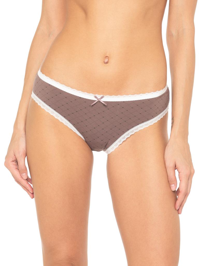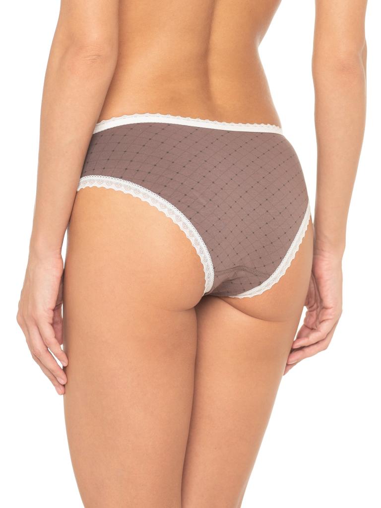 Трусы со средней линией талии, выполнены из нежного принтованного хлопка со спандексом. Контрастный геометрический принт. Вырез ножки и талия отделаны узким контрастным кружевом. Декор - атласный бантик. Хлопковая ластовица.