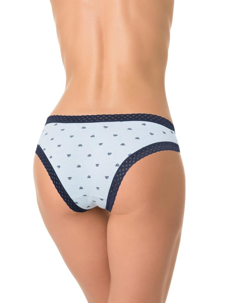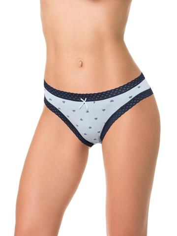 Трусы со средней линией талии, выполнены из мягкого принтованного хлопка со спандексом. Принт с изображением сердечек. Вырез ножки и талия отделаны контрастной широкой кружевной резинкой. Декор - атласный бантик. Хлопковая ластовица.