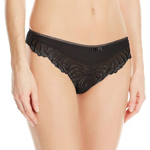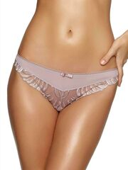 Трусы-стринги с низкой посадкой. Задняя панель и кокетка на передней выполнены из мягкого, эластичного тюля. Вставка из тюля с изысканной вышивкой в виде перьев на передней панели. Ластовица: 100% хлопок.