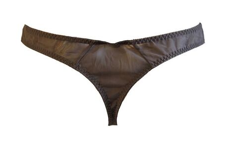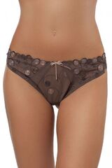 Трусы-стринги щедро украшены вышивкой, в особенности по талии, и выполнены из полупрозрачного материала. Элегантный атласный бантик удачно дополняет дизайн модели.