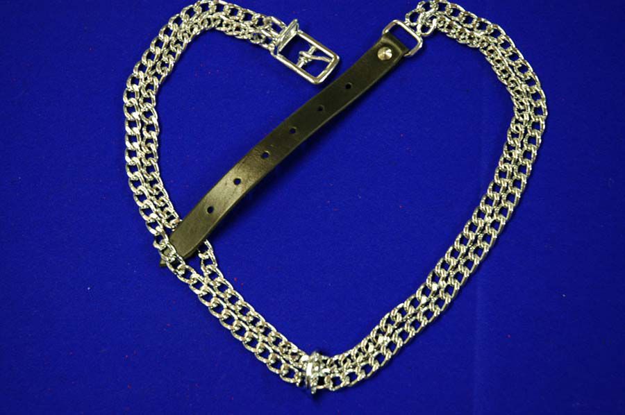 Выполнен в виде тройной металлической сварной цепи с D-кольцом для фиксации по центру. Застежка-кожаный ремешок. Ошейник в BDSM может иметь различные назначения. Он может использоваться в качестве антуража для создания образа. Может использоваться в практическом назначении как один из связующих элементов бандажа. А самое главное - он имеет глубокое психологическое значение, так как ошейник это основная эмблема подчинения и наказания.