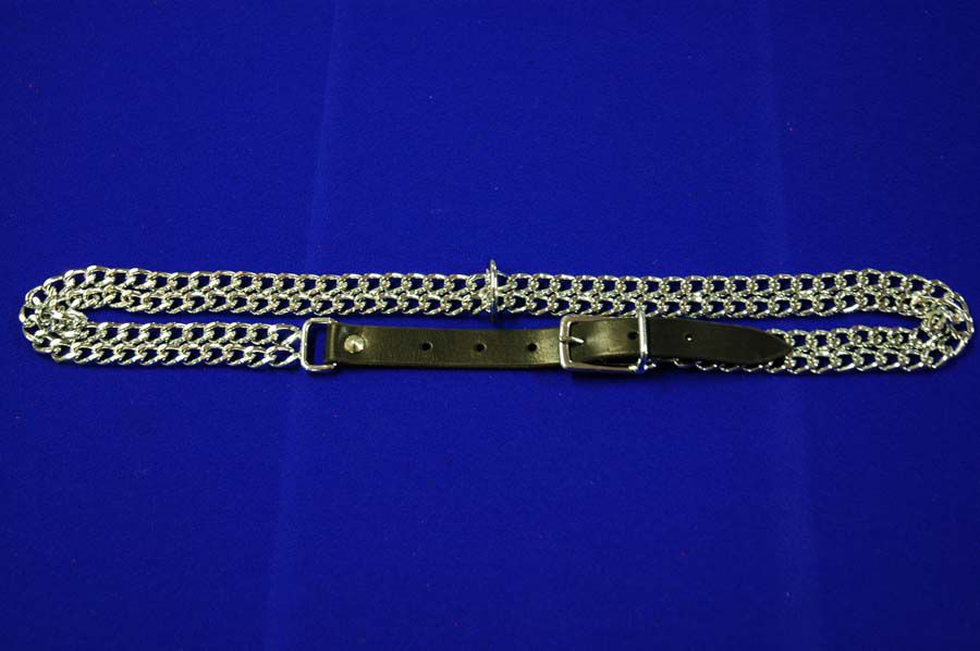 Выполнен в виде двойной металлической сварной цепи с D-кольцом для фиксации по центру. Застежка-кожаный ремешок. Ошейник в BDSM может иметь различные назначения. Он может использоваться в качестве антуража для создания образа. Может использоваться в практическом назначении как один из связующих элементов бандажа. А самое главное - он имеет глубокое психологическое значение, так как ошейник это основная эмблема подчинения и наказания.