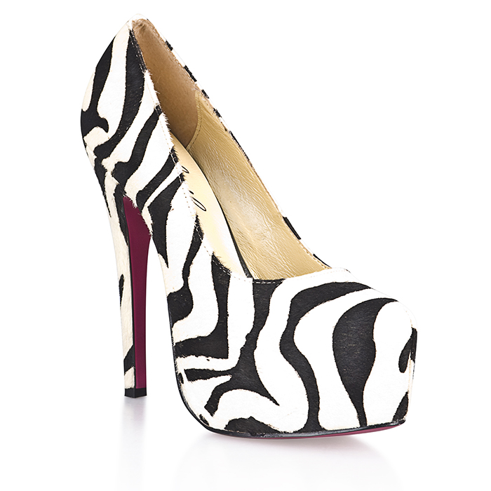 Белые в черную полоску или наоборот - это не столь принципиально. Главное, что в модных туфлях от Hustler из искуственной шерсти зебры ваш образ будет пестрить дикой изящностью и сексуальностью! Высокая устойчивая шпилька и потайная платформа в сочетании с мягкой искусственной шерстью под зебру придают туфлям поистине экзотичный вид. Высота каблука - 14 см, высота потайной платформы - 4,5 см.