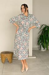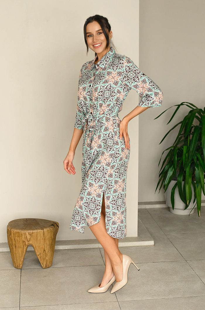 Туника выполнена из яркой принтованной вискозы. Модель на поясе прямого силуэта длины миди. Туника рубашечного типа с воротником стойкой и планкой застежкой на пуговицах. Рукав прямой длиной 3/4.