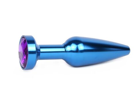 Удлиненная коническая гладкая синяя анальная втулка с кристаллом фиолетового цвета - 11,3 см.