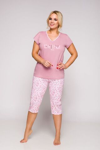 Женская пижама Donata состоит из футболки и принтованных бридж. Футболка с коротким рукавом и V-образным вырезом горловины. В комплекте: футболка, бриджи.
