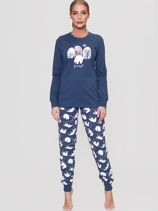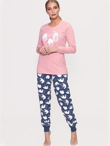 Трикотажный байковый комплект. Футболка с длинным рукавом, однотонная, впереди с принтом, брюки прямого покроя, внизу на манжете с рисунком. В комплекте: футболка, брюки.