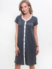 Домашний халат на пуговицах. Модель украшена локальным принтом с птицами на груди и отделкой светлой ткань по полочке и круглому вырезу горловины. Халат имеет удобный не облегающий силуэт, что особенно важно для комфортного отдыха. По бокам расположены удобные карманы.