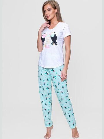 Трикотажный комплект. Футболка с коротким рукавом, однотонная, впереди с принтом, брюки прямого покроя с рисунком. В комплекте: футболка, брюки.