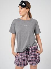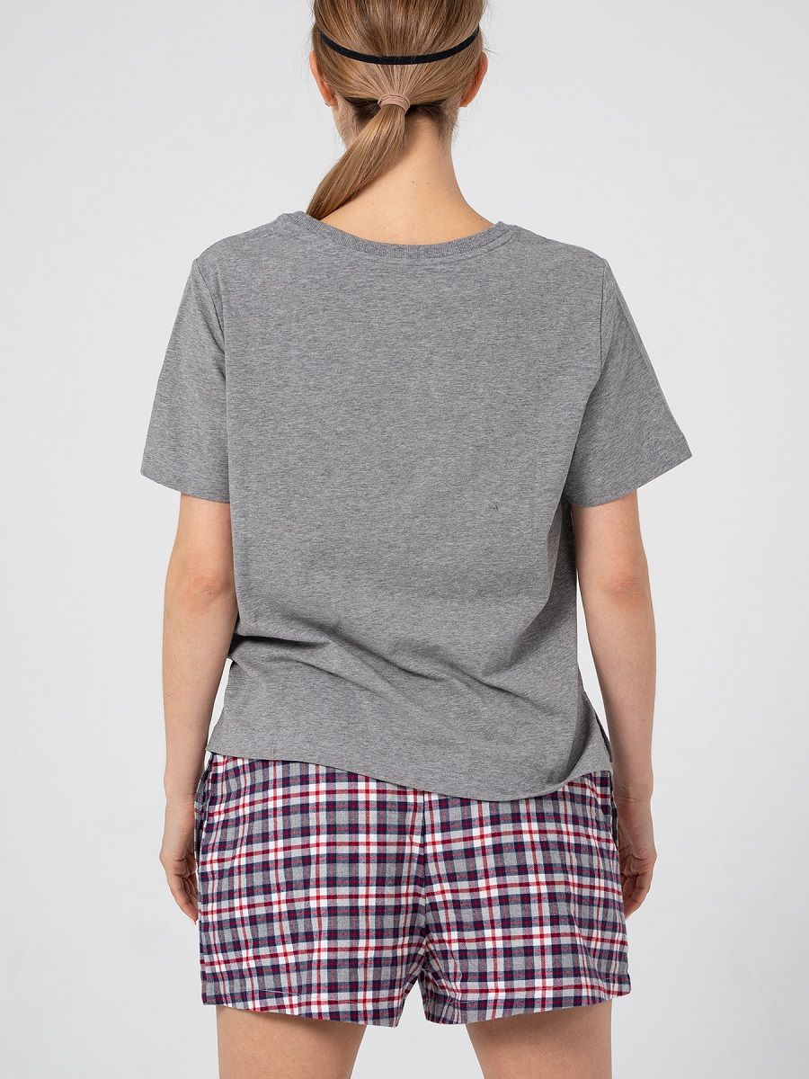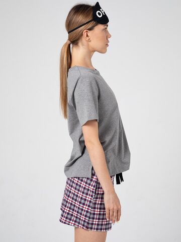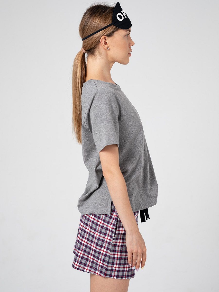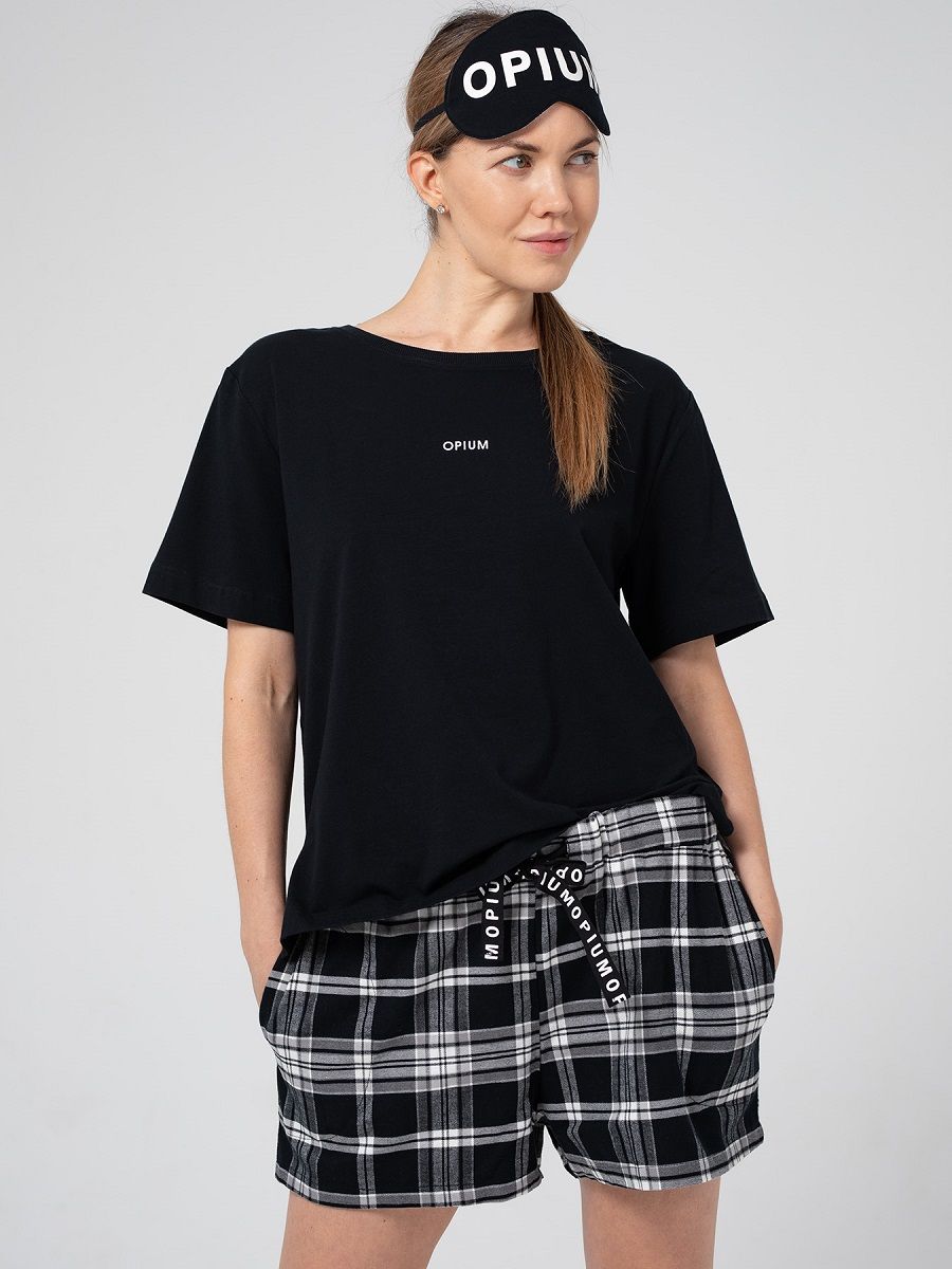 Набор для сна и отдыха: футболка, шорты, маска. Очаровательные шортики из мягкой фланели, с удобными боковыми карманами. Широкий пояс на резинке, дублированный кулиской с принтованной тесьмой. Футболка свободного кроя из хлопкового трикотажа, с женственным круглым вырезом, с коротким рукавом. Небольшого размера логотип на груди придает свежий акцент. Мягкая хлопковая маска – необходимый атрибут для сна. В комплекте: футболка, шорты, маска.