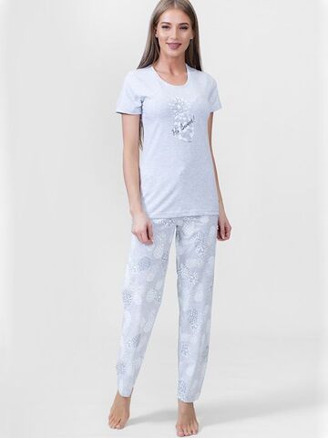 Трикотажный комплект. Футболка с коротким рукавом, из однотонной ткани, впереди с принтом, брюки прямого покроя с рисунком. В комплекте: футболка, брюки.