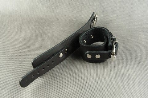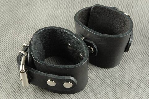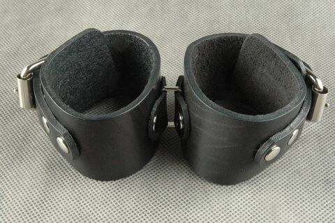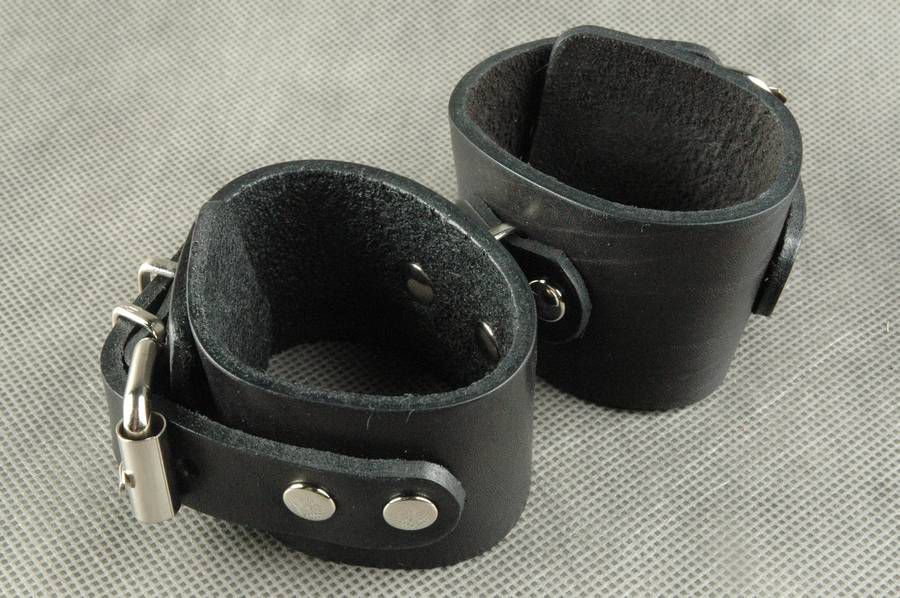 Наручники узкие, неподшитые, на ремешке с пряжкой, с жесткой фиксацией, соединенные между собой рамкой. Наручникии и поножи используются для ограничения физической активности партнера в бандаже. Они могут также играть роль фетиша. Самое главное - служат мощным психологическим атрибутом подчинения.
