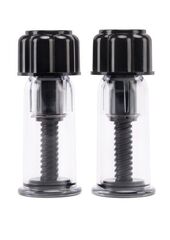 Пара вакуумных стимуляторов для сосков из пластика. Крупные, из черного и прозрачного прочного пластика. Вакуум создается путем выкручивания поршня за крупную черную головку стимулятора.