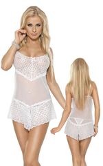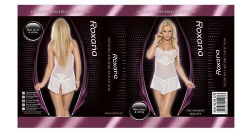Ажурный низ и верх, нижняя часть комбинации ( юбочка ) имеет разрезы спереди и сзади по центру. Лиф украшен розовым бантиком. В комплект входят стринги. В комплекте: сорочка, трусики-стринги.