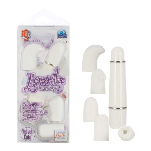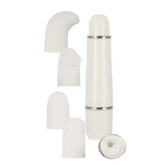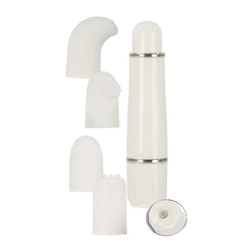 Мультифункциональный вибратор из белого с шелковистым покрытием TPR с тремя насадками в наборе. Прямой вибратор имеет 9 различных функций. Одна насадка загнута для наиболее удобной стимуляции точки G. Две другие имеют неровности и шипики. Батарейки в комплект не входят.
