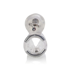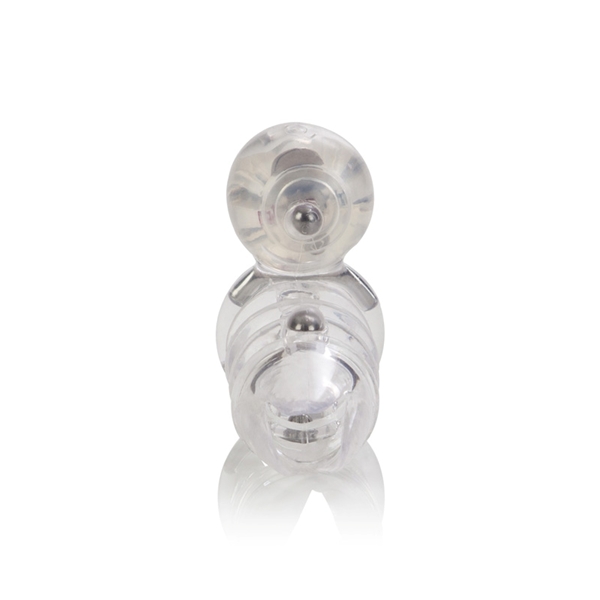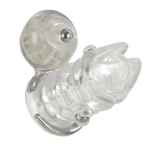 Прозрачная вибронасадка с клиторальным стимулятором. В основании имеется стальная дуга, что позволяет лучше поддерживать эрекцию. В плетении имеется два металлических шарика. Виброэллемент включается при контакте. Батарейки входят в комплект.