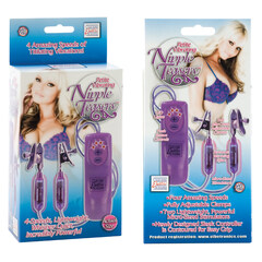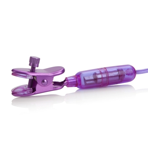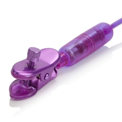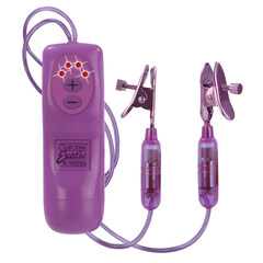 Вибростимулятор для сосков пурпурного цвета. Зажимы сделаны из металла с внутренней стороны покрыты гелем для более нежной стимуляции. Четыре скорости вибрации управляемые на панельке.