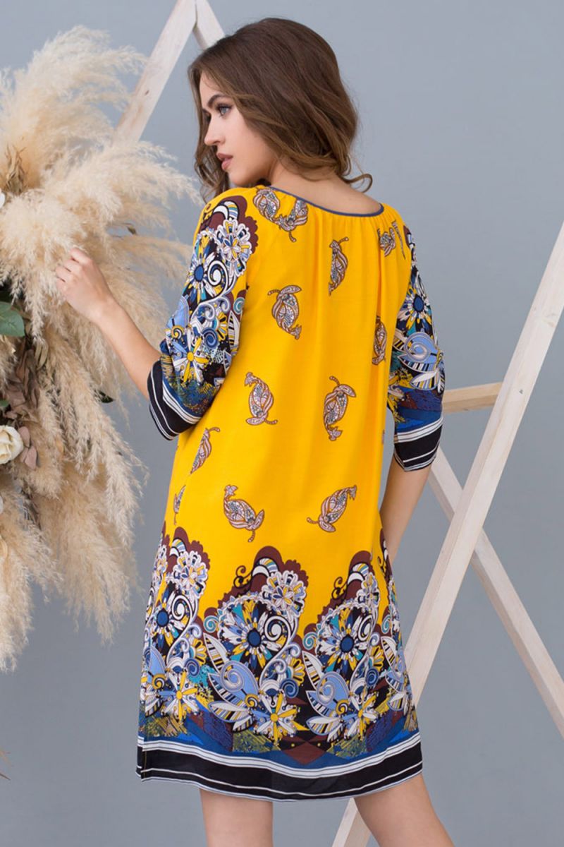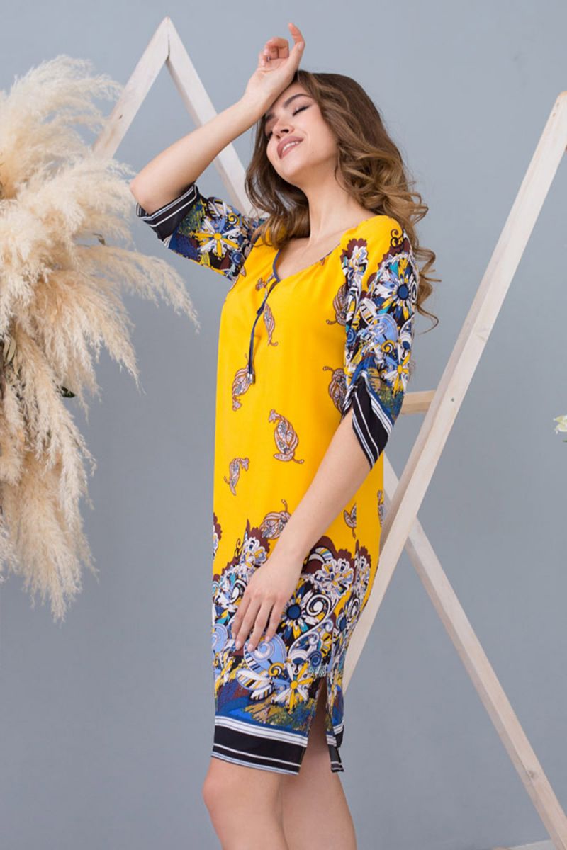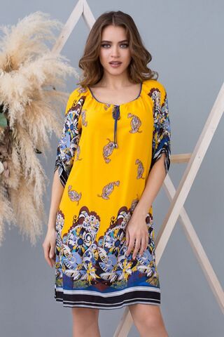 Туника прямого силуэта, с рукавом реглан, выполнена из принтованной вискозы. Круглый вырез горловины полочки и спинки окантован. На рукаве по бокам сборка на резинке. По боковым швам - разрезы.