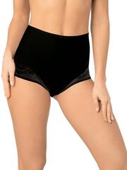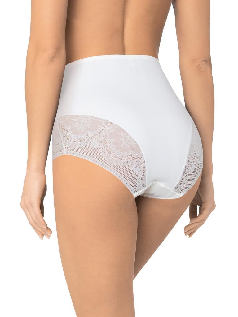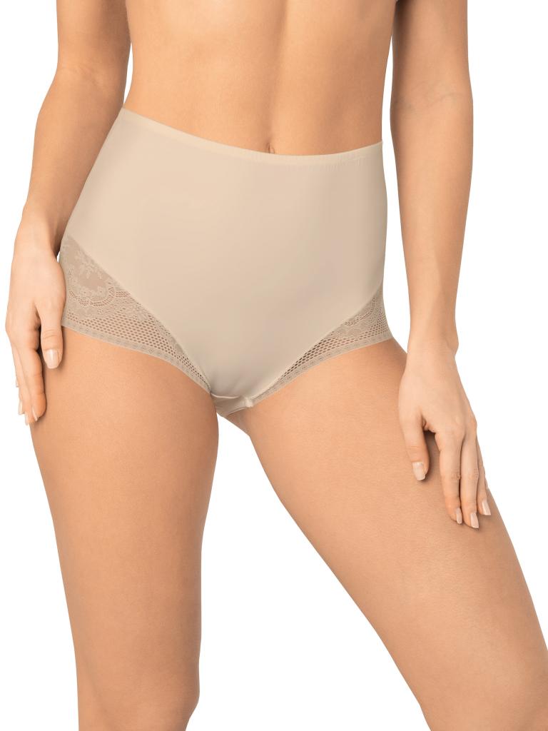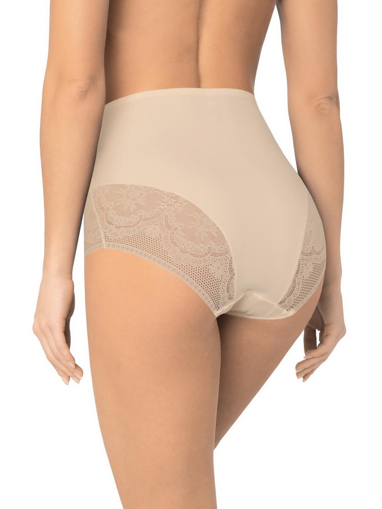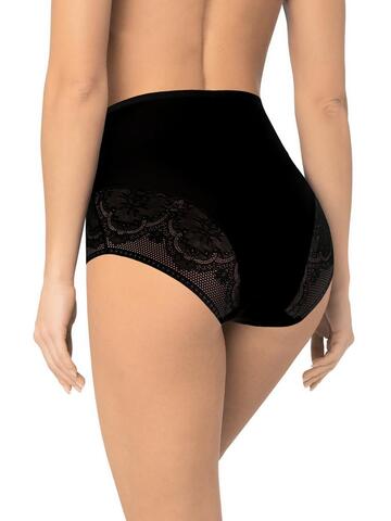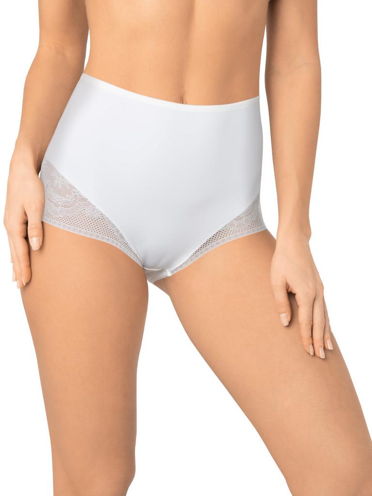Трусы с высокой линией талии. Выполнены из деликатного эластичного полотна. Вырез ножки декорирован плоским кружевом с цветочным рисунком. По талии пришита эластичная тесьма. Хлопковая ластовица. Благодаря особенностям кроя изделие абсолютно незаметно под одеждой, при этом трусы обладают легким корректирующим эффектом.