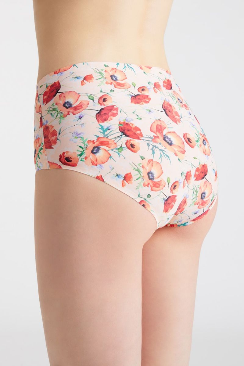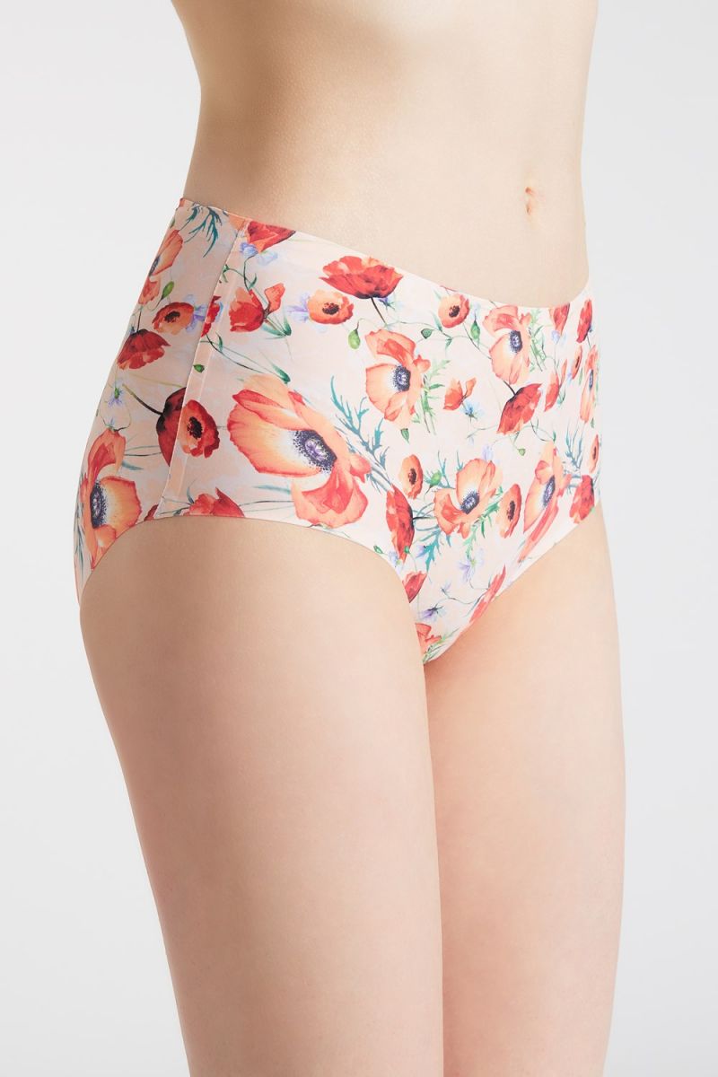 Трусы Poppies с высокой линией талии выполнены из дышащей современной ткани по технологии Invisible-Line (ультратонкая обработка краёв ткани) с цветочным принтом - живописные красные маки на нежном телесном фоне. Ластовица проложена 100% хлопком.
