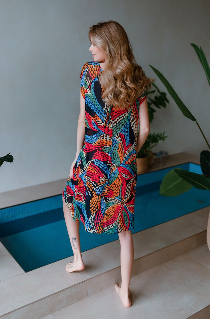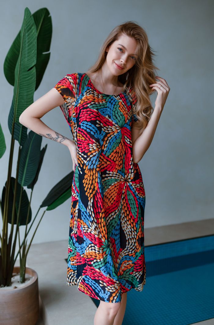 Туника пляжная женская средней длины выполнена из эластичной сетки с ярким принтом. Модель прямого силуэта с рельефами от проймы и рукавом реглан. Горловина спинки с разрезом-капелькой и завязкой из принтованной сетки для лучшей посадки по фигуре.