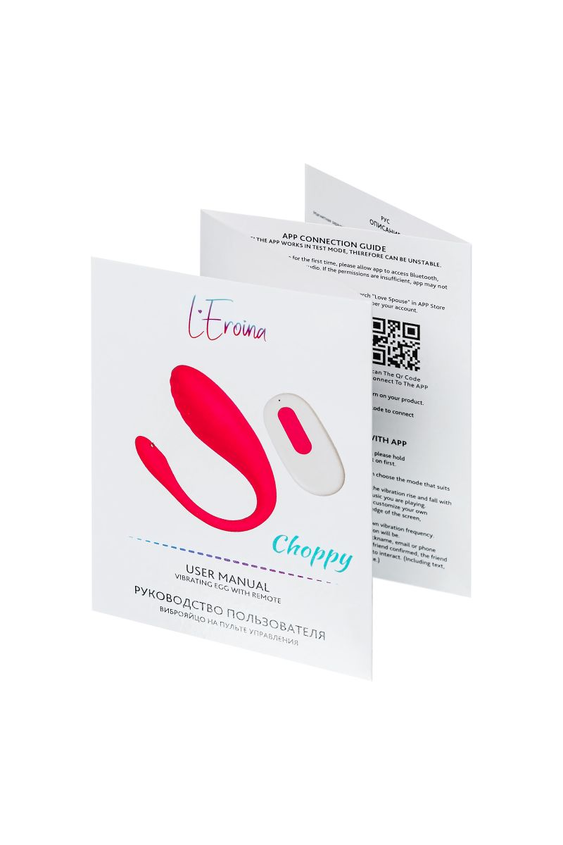 Choppy предлагает вместе расширить границы возможностей с приложением Love Spouse. Работа приложения осуществляется в тестовом режиме и может быть нестабильна. Перспективная функция управления Bluetooth через смартфон дает игрушке возможность вибрировать в такт музыке, реагировать на движения смартфона и рисунки на экране, и даже обеспечить присутствие партнера независимо от расстояния (в том числе текст, голос, видеовызов или запрос на управление устройствами друг друга). Рабочая длина - 10 см.