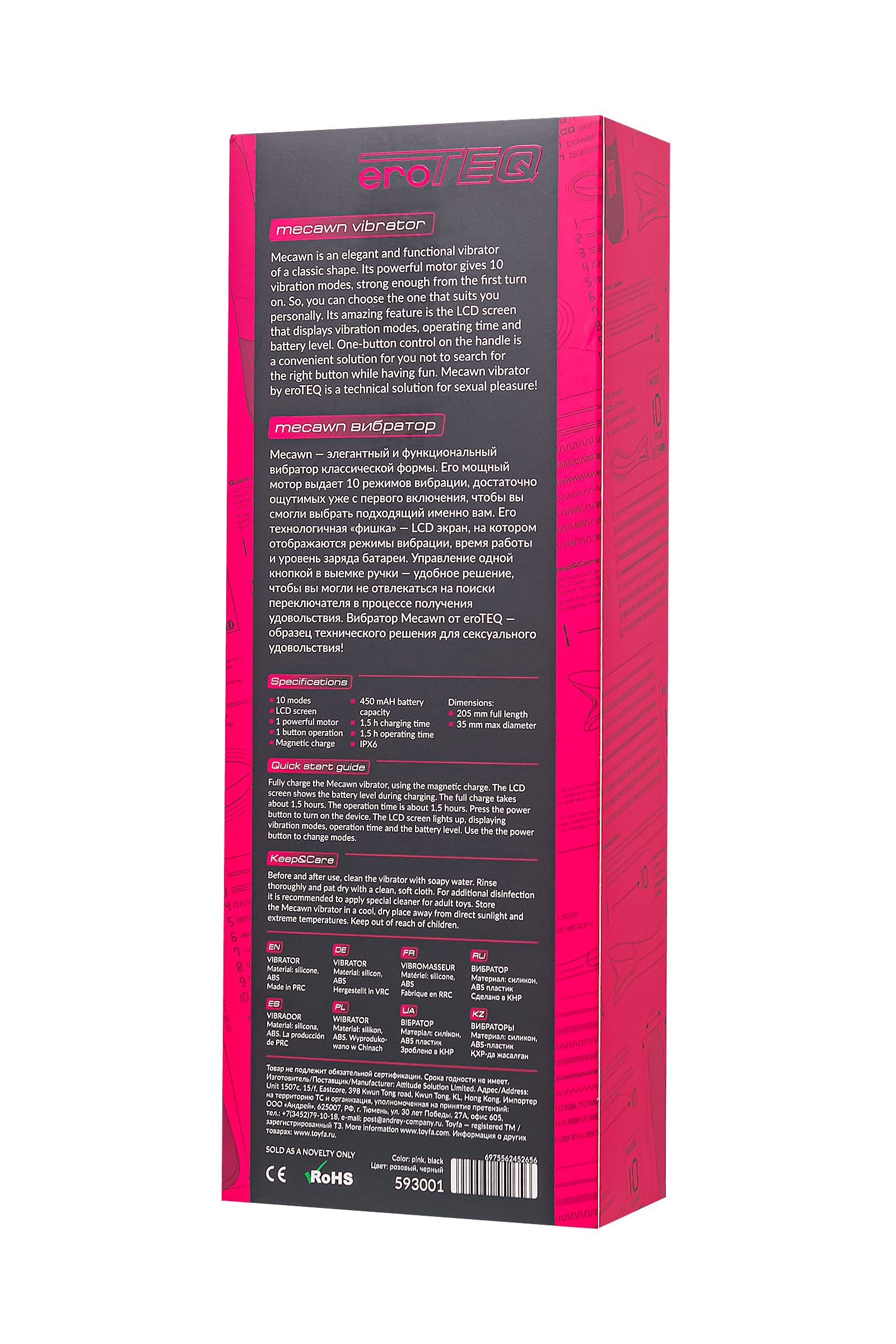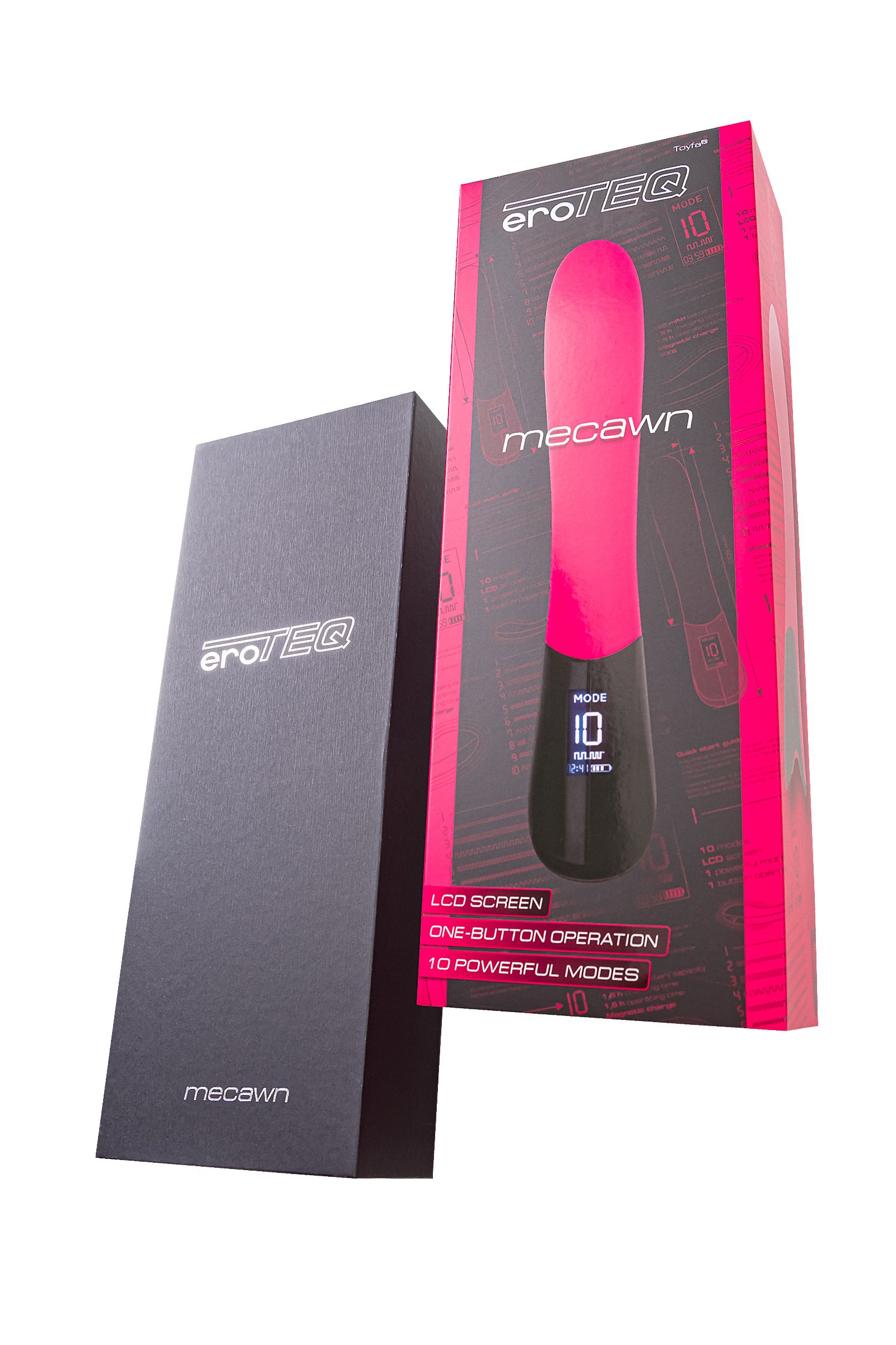 Впечатляйтесь функционалом игрушки даже в душе, благодаря водонепроницаемой технологии IPX6, обеспечивающей простоту в уходе. Рекомендуется использовать лубрикант на водной основе. Mecawn оснащен мощным двигателем и 10 режимами вибрации, каждый из которых продуман для постепенного возбуждения, готовя вас к невероятному оргазму. Мощь этого устройства ощутима уже с первых секунд использования. Революционная концепция Mecawn начинается с LCD экрана, который предоставляет полный контроль над всеми функциями - режимами вибрации, временем работы и уровнем заряда батареи.