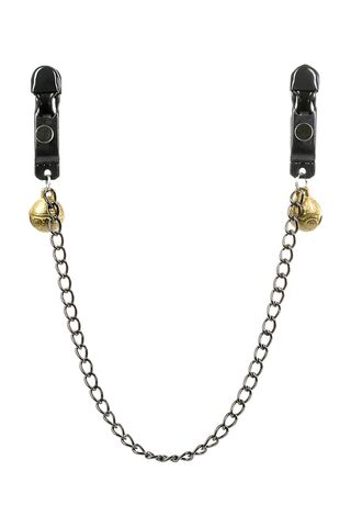 Металлические зажимы для сосков с этническим рисунком дополнены цепочкой. Они добавят перчинки в ваши игры: сами зажимы создадут дополнительную стимуляцию, а колокольчики озвучат каждое движение. Сила сжатия регулируется болтиком.