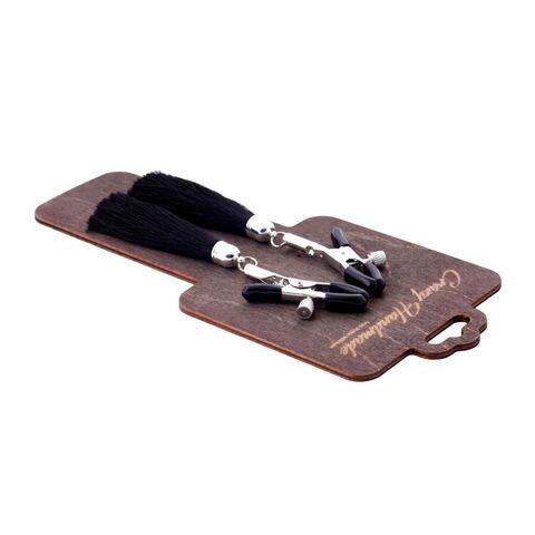 Зажимы мягко сдавливают соски за счет резиновых наконечников, а прикосновения кисточек из шелковых нитей приятно ощущаются на коже. Сила сжатия зажимов регулируется болтиками. Длина кисточки - 8 см.