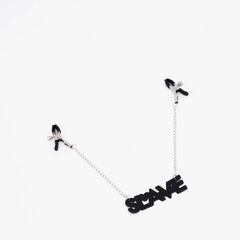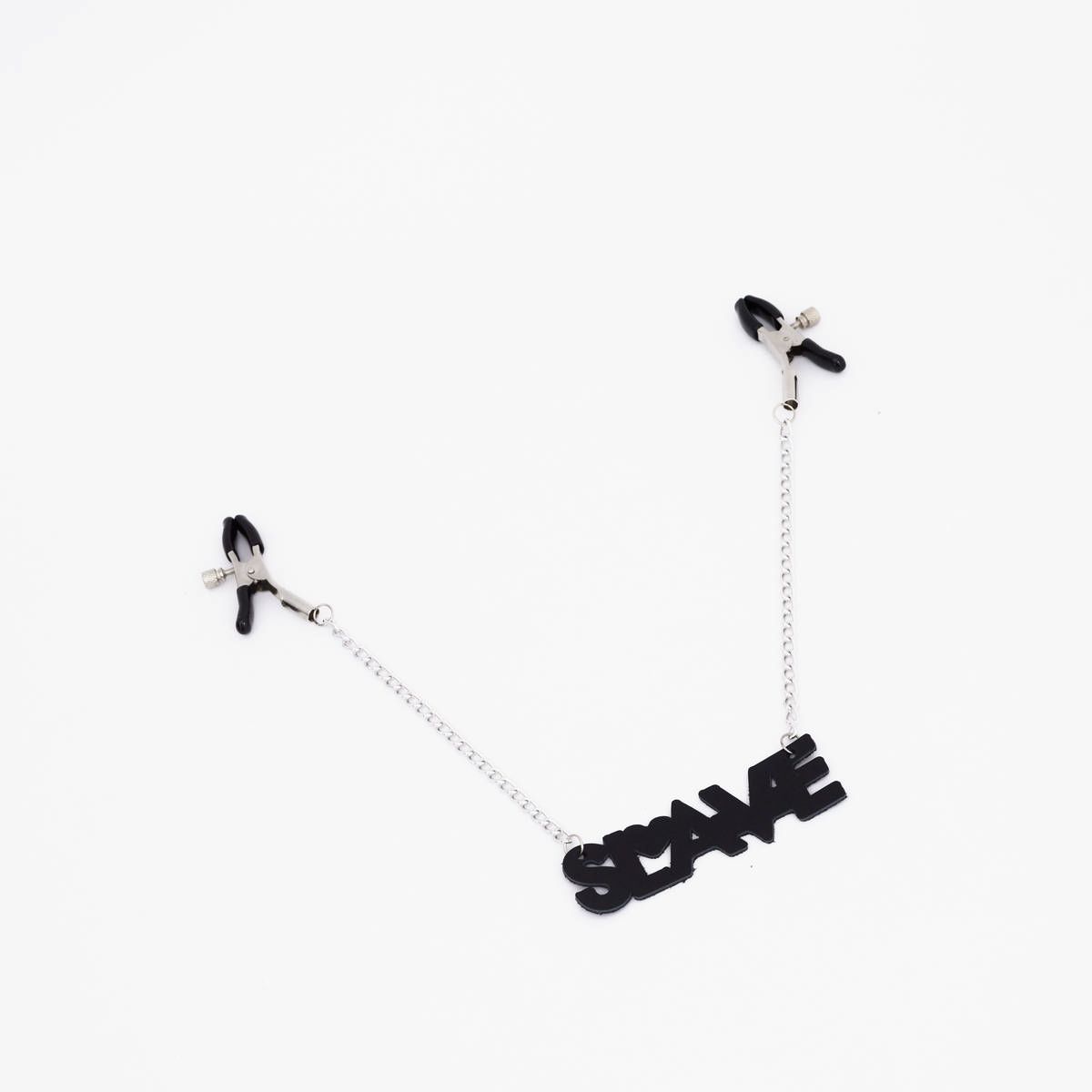 Зажимы оснащены мягкими резиновыми наконечниками , которые обеспечивают комфортное сжатие сосков, не травмируя кожу. Между собой зажимы соединены металлической цепочкой , на которой эффектно расположена надпись SLAVE , добавляющая изделию игривости и интриги. Сила сжатия регулируется с помощью подвижного колечка на зубцах , что позволяет настроить интенсивность воздействия под свои предпочтения.