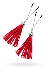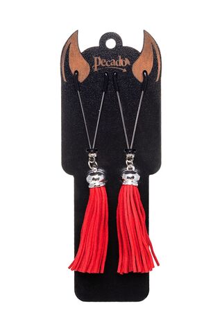 Попробуйте новые, дерзкие ощущения глубокого наслаждения! Зажимы-вилки от Pecado гарантируют смешение ярких чувств от тактильного контакта с нежной кожей сосков. Зажимы выполнены из высококачественных материалов. Металлическая часть компактная, приятная на ощупь. На концах черные резиновые наконечники, для безопасного воздействия на эрогенные зоны. Интенсивность сжатия аксессуара регулируется миниатюрными колечками. В зависимости от личных предпочтений и сценария игры, можно выбрать легкое пощипывание, или сильное сдавливание. Бахрома из натуральной замши, в насыщенном красном цвете, добавляет манящую красоту смелому атрибуту. При каждом соблазнительном покачивании груди, кисточки движутся в пикантном ритме. Также подходит для стимуляции и возбуждении в области половых губ и клитора.