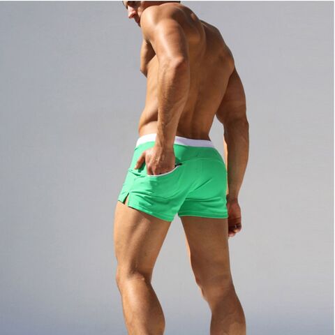 Зеленые мужские плавки-хипсы с белым поясом. Быстросохнущая ткань.