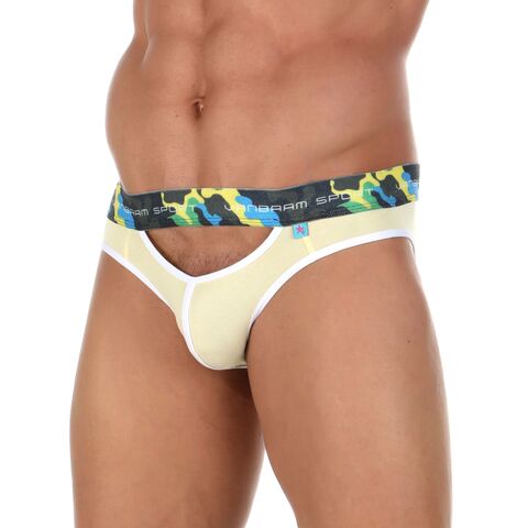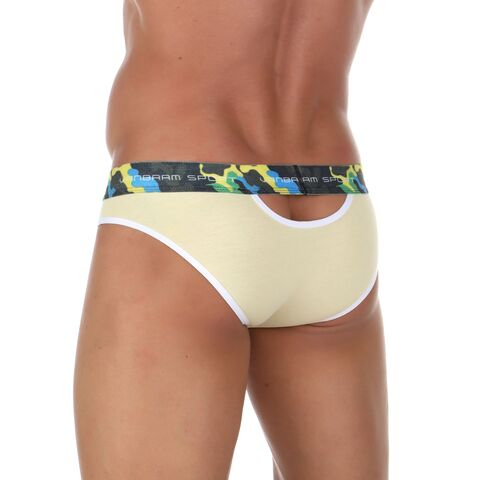 Желтые мужские трусы-слипы с пикантными вырезами под поясом.