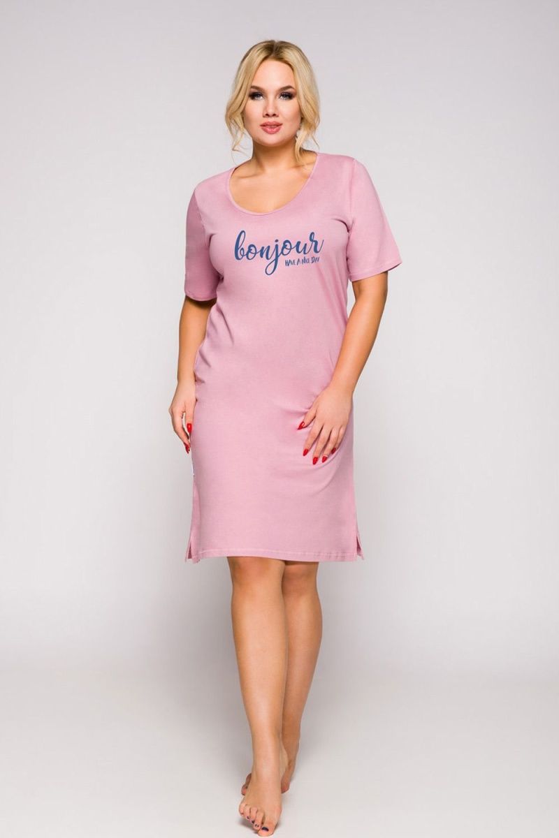 Женская хлопковая сорочка Bella свободного кроя, с коротким рукавом и боковыми разрезами. Сорочка декорирована принтом в виде надписи на груди.