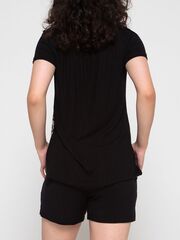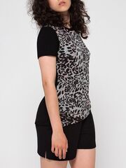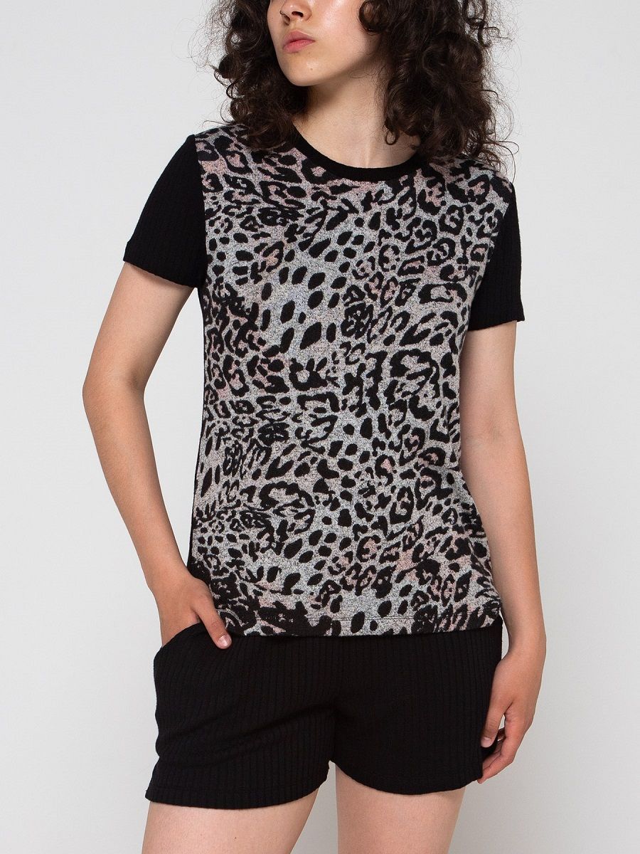 Женская пижама: шорты и футболка с леопардовым принтом. Удобные мягкие шортики на резинке, из вискозной ткани в рубчик, с внутренними боковыми карманами. Футболка скомбинирована из двух видов ткани: спинка и рукава как шорты, а перед из мягкого трикотажа с небольшим ворсом, с рисунком под леопарда. Модный анималистический принт уравновешен нейтральным черным цветом комплекта. В комплекте: шорты, футболка.