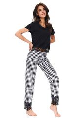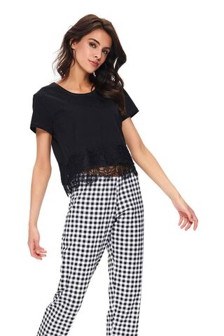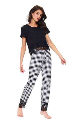 Стильная пижама выполнена из хлопкового полотна высшего качества, состоит из укороченного топа с короткими рукавами и клетчатых брюк. Брюки на широкой мягкой резинке, заужены к низу. Пижама декорирована красивым кружевом. Идеальный вариант не только для сна, но и для домашнего отдыха. В комплекте: топ, брюки.