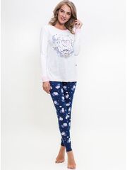 Трикотажный женский комплект. Футболка с длинным рукавом, однотонная, впереди с принтом, лосины на манжете с рисунком. В комплекте: футболка, лосины.