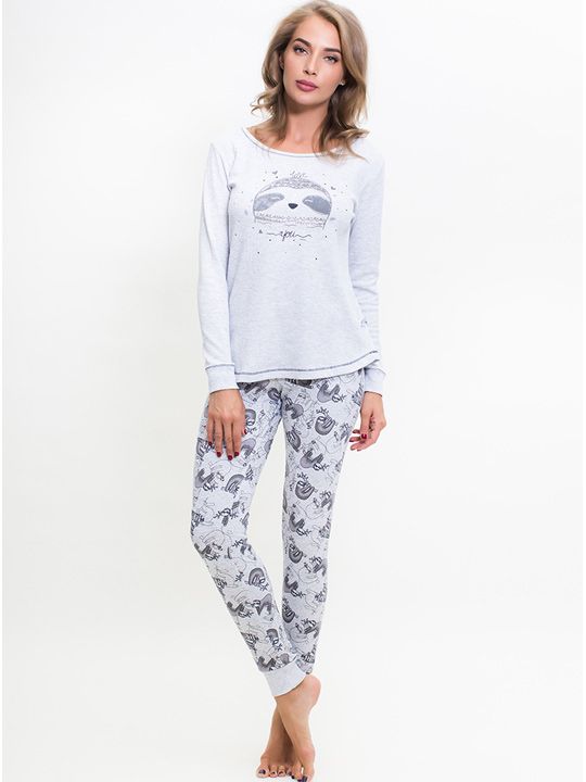 Трикотажный женский комплект. Футболка с длинным рукавом, однотонная, впереди с принтом, лосины на манжете с рисунком. В комплекте: футболка, лосины.